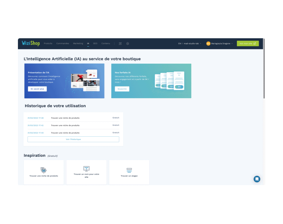 Elle se charge de créer le nom de votre boutique, le nom de domaine associé et le slogan qui vous correspond en quelques secondes. Ce n’est pas tout ! Notre IA rédige pour vous, vos fiches produits et vos articles de blog, traduit vos contenus, crée des publicités et bien plus encore…